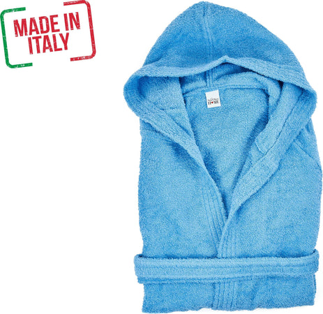 Accappatoio Azzurro Con Tasca E Cappuccio Avio Morbido Assorbente Made in Italy