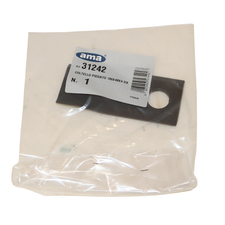 Il coltello piegato destro per falciatrice rotativa, con le sue dimensioni di 106x48 mm e un foro dal diametro di 19 mm, si adatta perfettamente alle esigenze in modo preciso.