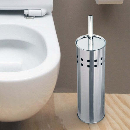 Bellissimo portascopino a cilindro con scopino in acciaio inox dal design semplice e minimale che darà un tocco speciale al tuo bagno.