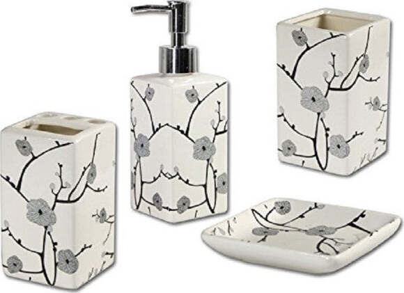 Set Bagno Fiori Pesco Giapponesi In Ceramica Dispenser Porta Saponetta Bicchiere