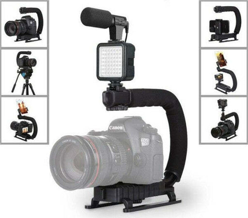 Stabilizzatore portatile per videocamere, actioncam, fotocamere e smartphone. Manico imbottito a forma di U riduce al minimo la pressione quando si scatta a lunghe distanze senza oscillare o sfocare. Dotato inoltre di una luce regolabile a 49 piccoli led e di microfono.