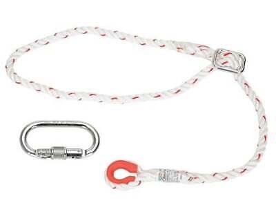 Elemento di ancoraggio a lunghezza regolabile mt. 0,85/1,5. In poliammide a tre fili con indicatore di usura, Ø 14 mm., carico di rottura 3300 Kg., fibbia passante di regolazione in lega leggera e moschettone ovale in acciaio zincato anticorrosione chiusura di sicurezza automatica e blocco manuale, Ø 16 mm.