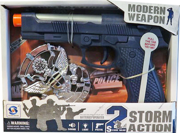 Set polizia con pistola e distintivo per immaginare azione e combattimenti contro il crimine e stimolare la fantasia dei bambini. Pistola Giocattolo blu con luce e suono.