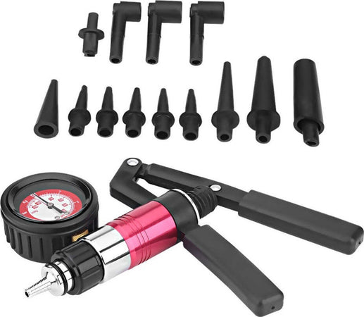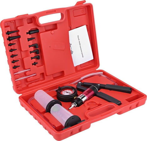 KIT TESTER E POMPA PER SPURGO FRENI A VUOTO. Con il Tester, si può facilmente verificare la tenuta del sistema frenante o condizionatori d'aria senza elettricità o aria pressione, spurgare o cambiare liquidi per freni. Pratico adatto per quasi tutte le auto. Controlli di vuoto / pressione azionate componenti auto motive. Può essere usato per spurgare sistemi idraulici o fluidi sifone.