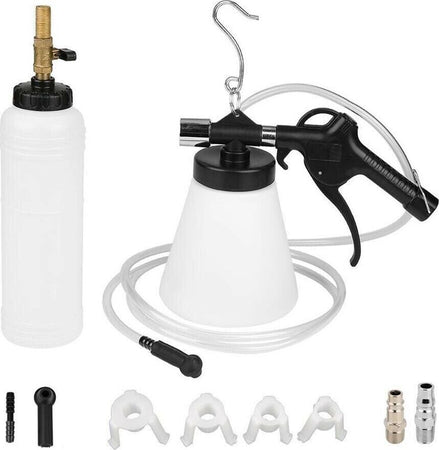 Devi spurgare i freni dell auto per sistemarli? Il nostro kit restituirà forza ai tuoi freni potrai utilizzarlo per la tua moto o la tua autovettura senza problemi. Lo spurgatore per freni estrae il liquido dal nipplo di spurgo al fine di spurgare o cambiare completamente il liquido dei freni. Compreso di un tubo flessibile per l aspirazione del liquido e 4 adattatori una volta installato il kit avrai bisogno solo di un alimentazione di pressione standard da 6-12 bar.