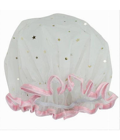 La confezione include due cuffie per doccia con elastico e bordino rosa con stelle e lune.