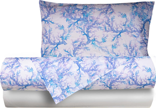 Completo Letto Lenzuola Federe Bifaccia Double Face Stampa Digitale In Cotone Made In Italy Coralli Acquerello Bianco
