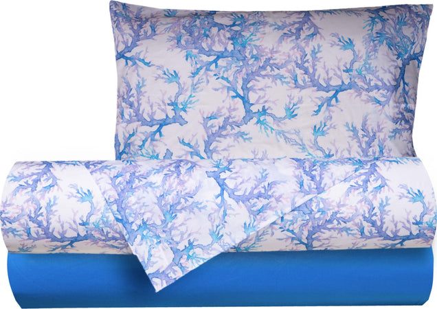 Completo Letto Lenzuola Federe Bifaccia Double Face Stampa Digitale In Cotone Made In Italy Coralli Acquerello Bluette