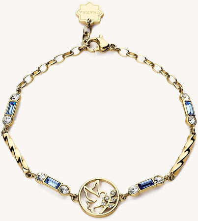 Bracciale da donna di Brosway della collezione chakra. Bracciale chakra in acciaio 316l, finitura oro, con colomba simbolo di pace, leggerezza, rinascita e cristalli ametista chiaro e crystal. Lunghezza: 175 mm. Peso: 4,2 g.