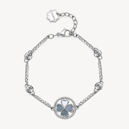 Bracciale semirigido in acciaio 316L con centrale a forma di quadrifoglio con madreperla verde e cristalli crystal.