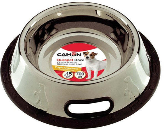 Ciotola in acciaio con base più larga in gomma che ne impedisce il rovesciamento.