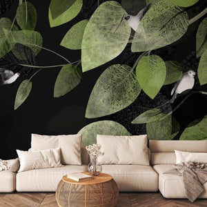 Carta da parati - Abstract landscape - green mountains with golden patterns and birds