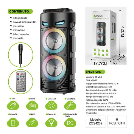 Su commercioVirtuoso.it trovi Diffusore portatile cassa bluetooth mp3 karaoke usb aux 10 watt 1500mah ZQS4239 del marchio Mulin, disponibile direttamente dal negozio italiano partner CL Store - Battipaglia. Questo negozio è stato selezionato con cura per garantire qualità, autenticità e spedizione rapida.