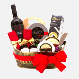 Cesti regalo con conserve vasetti e cibi in scatola,
