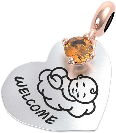 Charme Donna Rerum 25048 della collezione Momenti in argento 925 a forma di cuore con incisione “Welcome” – “Benvenuto”. Al passante, placcato oro rosa 18kt, è agganciata una pietra di citrino.