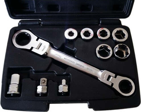 Nuovissimo set multiuso con chiave a cricchetto (non reversibile sul singolo lato ma bisogna capovolgerla). Ideale per professionisti nel settore della meccanica.