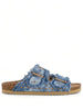 La ciabatta più amata dell'estate, in una nuova e fresca rivisitazione del denim style. La giocosa originalità della texture in denim di cotone è impreziosita da una lavorazione di borchie e strass, alla quale si alterna una raffinata bordatura sfrangiata. Le fibbie ton sur ton rendono la calzatura leggera e graziosa. Perfette con abiti leggeri e hot pants abbinati a maglie over.