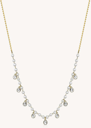 Collana girocollo in acciaio 316L e finitura pvd oro 14K con cristalli e perle di conchiglia.