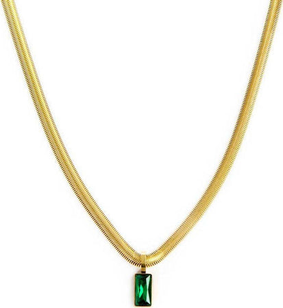 Collana con catena snake con cristallo verde pendente a taglio baguette. Lunghezza totale 45 cm regolabile da 45 a 42 cm tramite cursore. Marlù logo tag ovale presente all'estremità.
