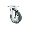 Ruote piastra girevole. Supporto ancoraggio a piastra 60 x 60 mm. Realizzato in supporto girevole in acciaio stampato rotante su doppia corona di sfere in acciaio, ruota gomma sintetica flangiata in termoplastico. Massima portata 55 Kg