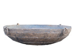 Il contenitore presenta un diametro di 144 cm e un'altezza di 39 cm, misurate nell'ingombro massimo. Realizzato interamente a mano in ferro battuto, si distingue per la sua lavorazione accurata. L'immagine mostra un oggetto di aspetto rustico e vissuto, con una finitura che suggerisce un utilizzo preesistente. Può essere impiegato come braciere, fioriera, vasca per piante acquatiche, o semplicemente come elemento decorativo.