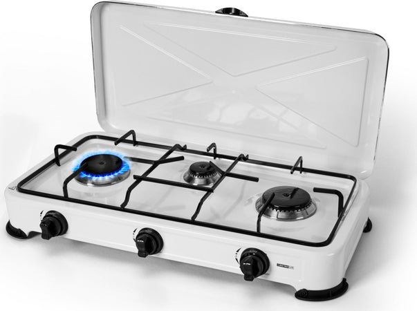 Fornello a gas da campeggio 3 fuochi con coperchio fiamma regolabile