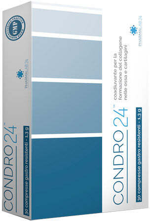 Integratore alimentare multifasico ad azione sinergica formulato in accordo con le più recenti acquisizioni di evidence based medicine (EBM). Ciò significa che la sua composizione è supportata dalle più recenti evidenze scientifiche riscontrabili in letteratura medica, a garanzia di efficacia del prodotto stesso. Il sinergismo d'azione dei singoli componenti, in grado di agire su diversi livelli, consente un'integrazione alimentare in grado di garantire il sostegno dell'apparato osteoarticolare in tutte quelle situazioni in cui risulta necessario integrare l'alimentazione al fine di svolgere un'azione coadiuvante o ancillare ad altre terapie con FANS o cortisonici. In sintesi Condro24, pur essendo un integratore alimentare e non un farmaco, è utile per sostenere la fisiologica integrità delle articolazioni. Condro24 è utile in tutti i casi di processo degenerativo artrosico caratterizzato da un ridotto apporto con la dieta o da un aumentato fabbisogno nutrizionale delle componenti in esso contenute in particolare glucosamina condroitina e nucleotidi liberi. Tutti questi elementi nutrizionali sono fondamentali per la "vita della cartilagine" e dell'osso nel suo complesso.