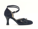 Scarpe da ballo con cinturino incrociato alla caviglia in camoscio e vernice nera tacco 7 a rocchetto sottopiede in camoscio anti scivolo e suola in bufalo. Made in Italy.