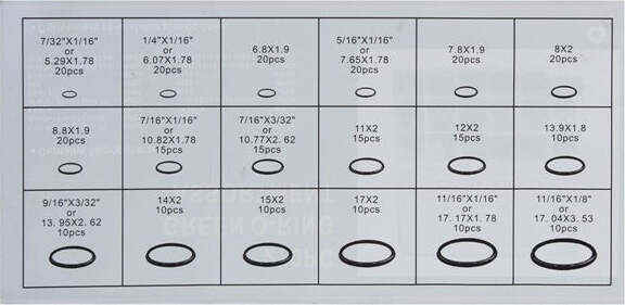 Nuovo, utile e pratico set di guarnizioni (O-RING) composta da 18 misure per un totale di ben 270 pezzi. Tutte le guarnizioni sono racchiuse e suddivise, nelle loro forme, in una pratica scatola di plastica, cosi da poterle sempre portare con se. Queste guarnizioni elastiche sono utilissime in lavori meccanici, idraulici e/o di pneumatica.