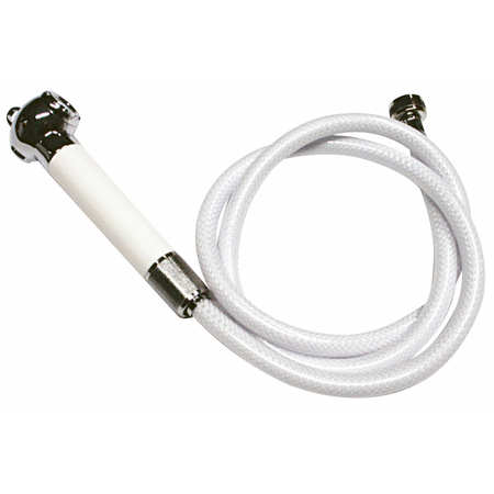 Doccia a mano in plastica bianca e ottone cromato con pulsante push-off, completa di tubo bianco.