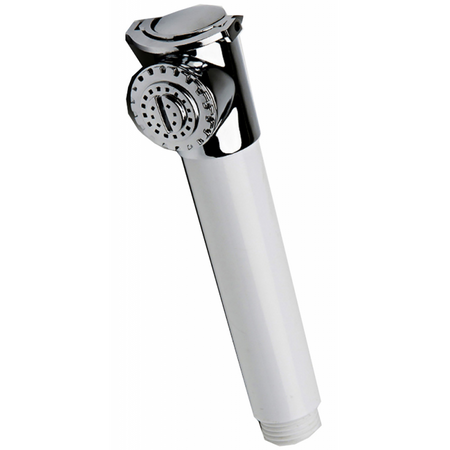 Doccia con testa in ottone cromato e impugnatura in ABS bianco, con pulsante push-off. Attacco 1/2 maschio. Per tubo art. 2424212/4 o similari.