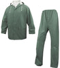 Completo da pioggia giacca e pantaloni. Cuciture saldate. GIACCA : Cappuccio fisso. Chiusura zip anti-freddo sotto baverina a pressione. Maniche raglan. Polsini interni elasticizzati. 2 tasche. PANTALONI : Elastico in vita. Patta chiusura a pressione. Parte bassa regolabile a pressione. 2 passamano.