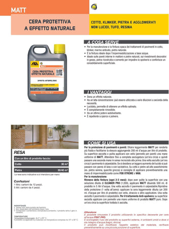 La cera protettiva MATT è un prodotto ideale per la manutenzione e la finitura opaca di pavimenti in cotto, klinker, marmo anticato e pietra naturale. Questa cera è particolarmente indicata dopo l'applicazione di impermeabilizzanti a base acqua ed è perfetta per le pareti interne in mattoni e pietre naturali, così come sui rivestimenti decorativi in gesso, pietra ricostruita e cemento, aiutando a prevenire lo spolverio e fornendo un consolidamento superficiale.