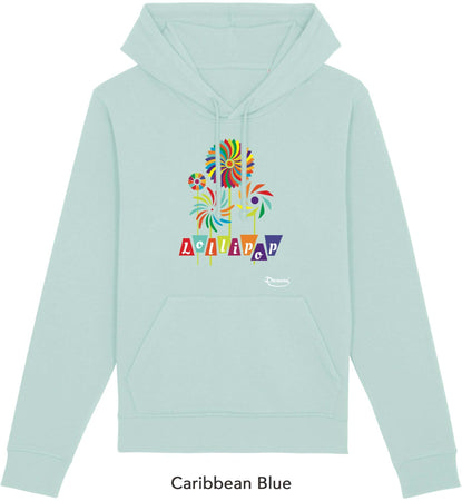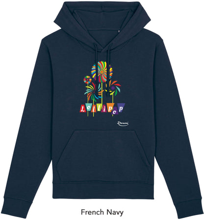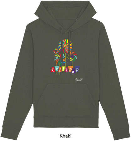 Felpa donna con cappuccio e tasche, giovanile ed elegante, la stampa serigrafica Lollipop è perfetta per una passeggiata nel parco. In morbido cotone organico.