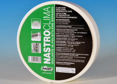 Nastro adesivo in polietilene espanso reticolato, per isolamento termico di impianti di aria condizionata. È rinforzato con rete di poliestere. Il polietilene espanso possiede ottime capacità isolanti oltre ad un’alta flessibilità, inoltre le sue cellule completamente chiuse assicurano un’efficace barriera al vapore.