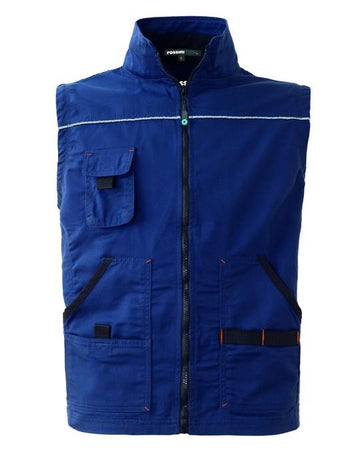 Gilet da lavoro con collo alla coreana e chiusura anteriore con cerniera. Un taschino applicato al petto destro chiuso con aletta e velcro, due tasconi inferiori con taschini applicati chiusi con punto velcro. Carré anteriore e posteriore profilati con coda di topo rifrangente, inserto in nylon. 60% cotone drill, 40% poliestere. Peso 250 g/m² I^ Categoria per rischi minimi