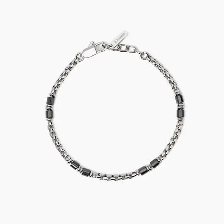 Bracciale in acciaio 316L con catena veneta 3.5 mm e cilindri di ceramica nera 4xØ4 mm, lunghezza regolabile da 19 a 21 cm, chiusura a moschettone.