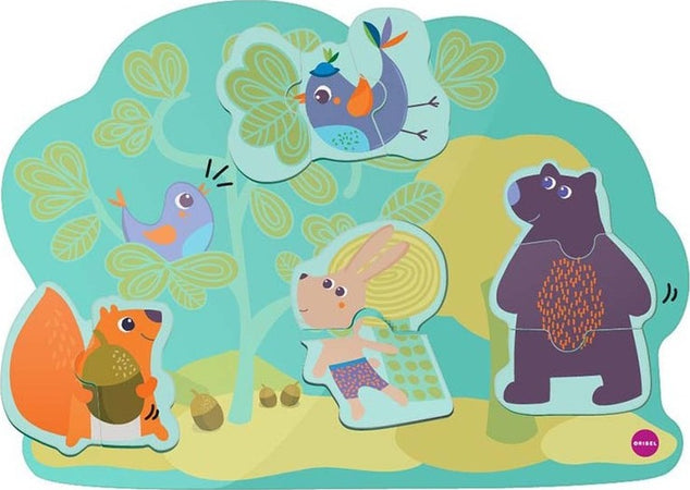 Il vivace coniglietto e i suoi amici saltellano da un albero all’altro; questo bosco accogliente è una grande famiglia felice.