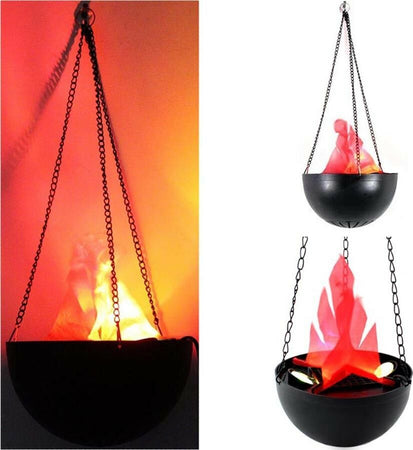 Lampada effetto fiamma a sospensione il funzionamento è semplicissimo ritagli di raso a forma di fiamma due faretti ed una ventola che genera vento e produce un effetto fiamma molto particolare e scenografico. Ideale sia per allestire ed abbellire locali pub piscine bellissima da mettere in giardino. La lampada è comprensiva anche di catenella della lunghezza di 45 cm.