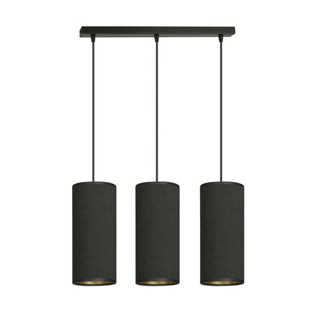 Lampadario 3 luci con base rettangolare in acciaio nero e 3 paralumi tessili di forma cilindrica di colore nero all'esterno e oro all'interno. La lunghezza regolabile dei cavi consente la personalizzazione in base alle esigenze individuali. I paralumi sono realizzati in materiale resistente con una texture vellutata e un centro dorato. La struttura semplice e l'elegante combinazione di colori lo rendono una scelta versatile per vari spazi.