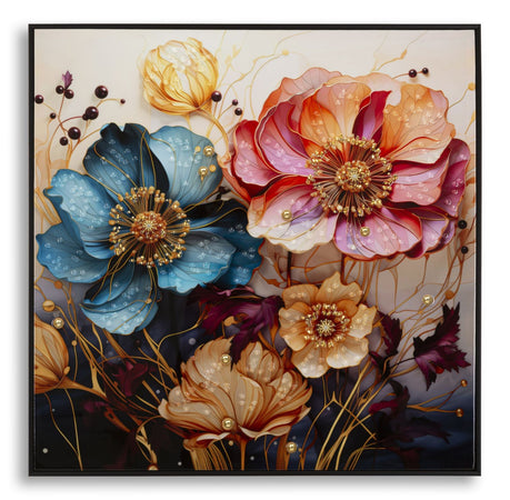 Dipinto su tela completo di telaio in legno e cornice in metallo nero, con vibranti fiori multicolori perfetti per illuminare qualsiasi ambiente con freschezza e vitalità. Con applicazioni in rilievo.