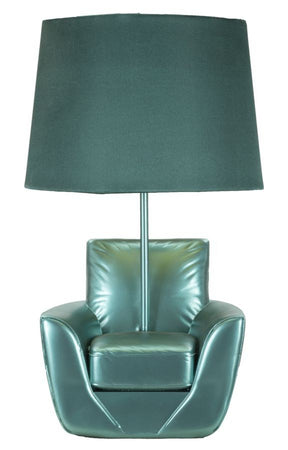 Lampada da tavolo in resina turchese a forma di poltrona ispirata agli anni '70. Completa di paralume in tessuto turchese.
