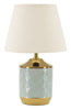 Lampada in ceramica celeste con rifiniture dorate dal design semplice ed elegante. Completa di paralume in tessuto bianco.