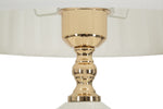 Lampada in ceramica bianca con rifiniture dorate dal design semplice ed elegante. Completa di paralume in tessuto bianco.