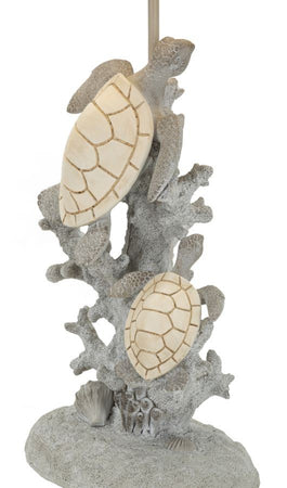 Lampada da tavolo in resina impreziosita da simpatiche tartarughe marine. Completa di paralume in tessuto beige.