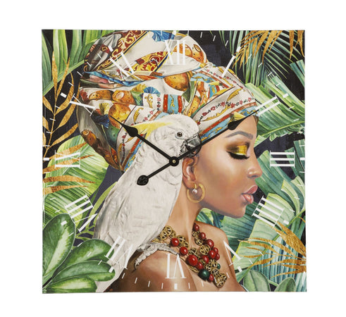 Orologio da parete raffigurante una donna con un pappagallo in un ambiente naturale. I colori accesi e vivaci e le eleganti applicazioni in tessuto donano un tocco di eleganza. Funzionamento con batteria AA non inclusa.