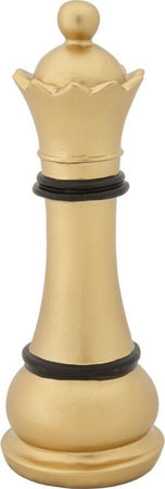 Elegante scultura dorata con finiture nere a forma di regina degli scacchi.
