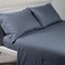 L'immagine mostra un completo lenzuola piegato, di colore blu scuro, che evidenzia la texture del cotone e la confezione curata.