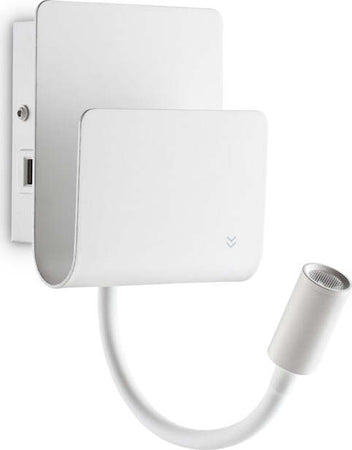Applique con corpo luce rettangolare in alluminio verniciato a polveri bianco. Doppio diffusore: superiore in acrilico e inferiore con braccetto flessibile.. Sorgente Led integrata 9 W 3000 K (tonalità calda). Interruttori indipendenti incorporati.
