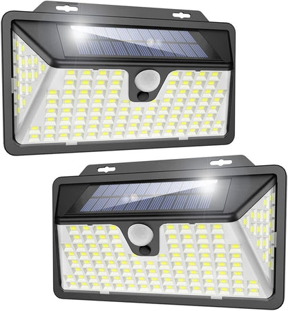 Luci di sicurezza solari Kaulsoue per esterni con sensore di movimento - Lampada da parete a energia solare IP65 impermeabile 128 LED 270° grandangolo 3 modalità di illuminazione per esterni, recinzione, giardino, patio (confezione da 2) [Classe energetica A+++]
